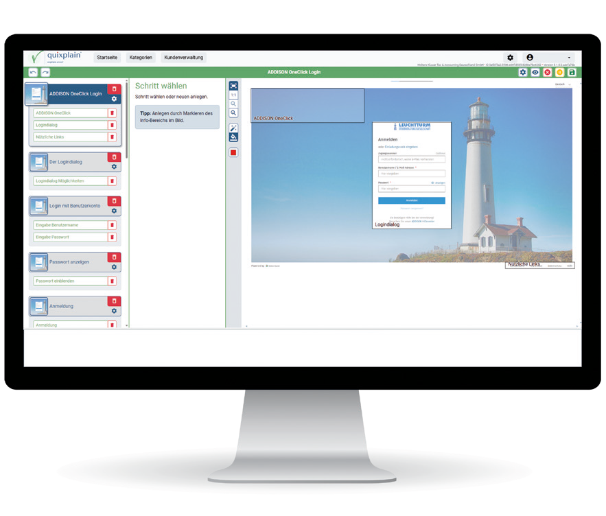 Mit dem Quixplain-Editor können Sie kinderleicht eigene Klick-Tutorials, z. B. auch für das Ausfüllen von Formularen, erstellen und Ihren Mandanten zur Verfügung stellen.